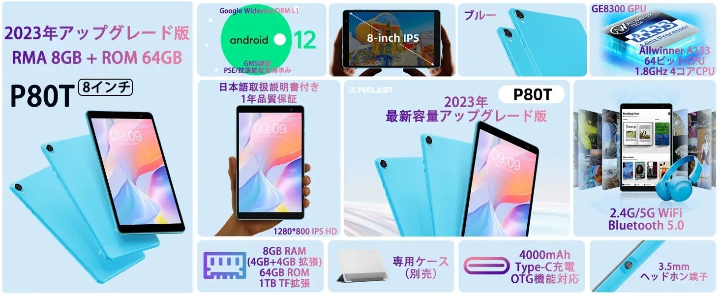 - P80Tは、8インチのIPS HDディスプレイ、Android 12、8GB RAM、64GBストレージ、WiFiモデルなどを備え、適用価格は15% OFFの10,960円。両モデルとも、性能や機能が充実しており、ゲームにも最適です。