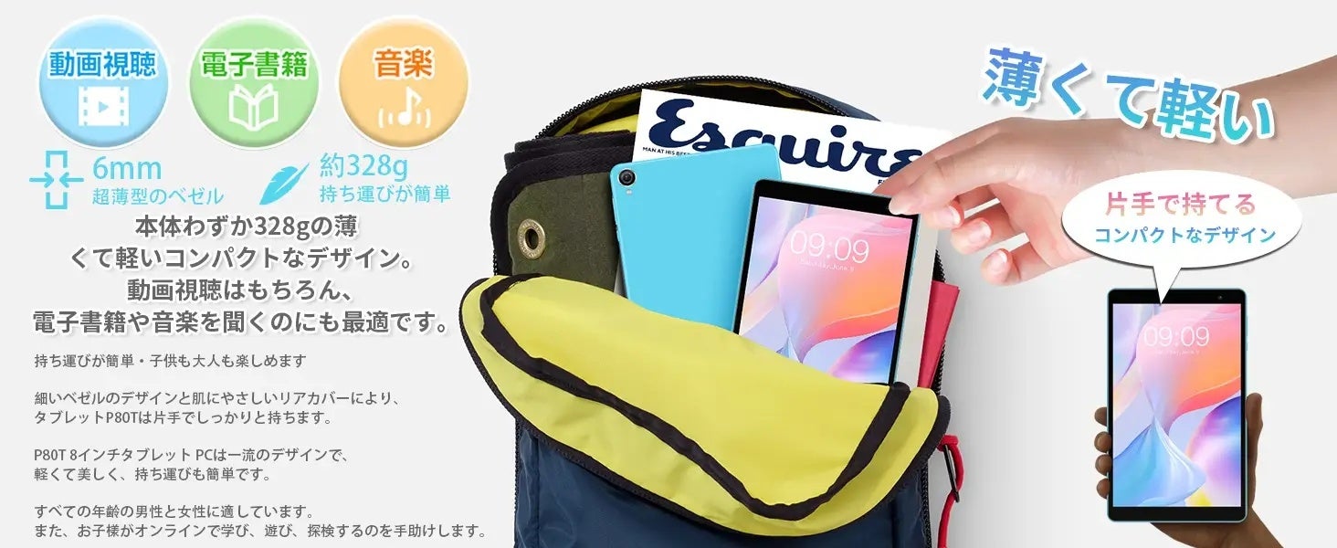 Teclast「P80T」は、8インチのコンパクトさに超薄型の6mmベゼルを設計、簡単に片手で取り扱う可能です。重量は約310gで、軽量でポータブルです。鮮やかなアクアブルーデザインを採用し、厳選された色で仕上げて、野外使用時明るくて注目、魅力で個性です。