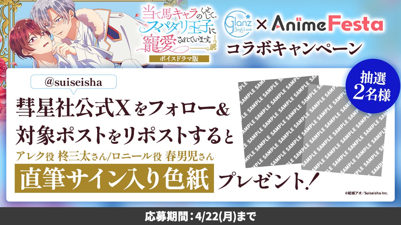 - 2024年4月より新作BLアニメ「当て馬キャラのくせして、スパダリ王子に寵愛されています。」のボイスドラマ版がAnimeFestaで配信開始
