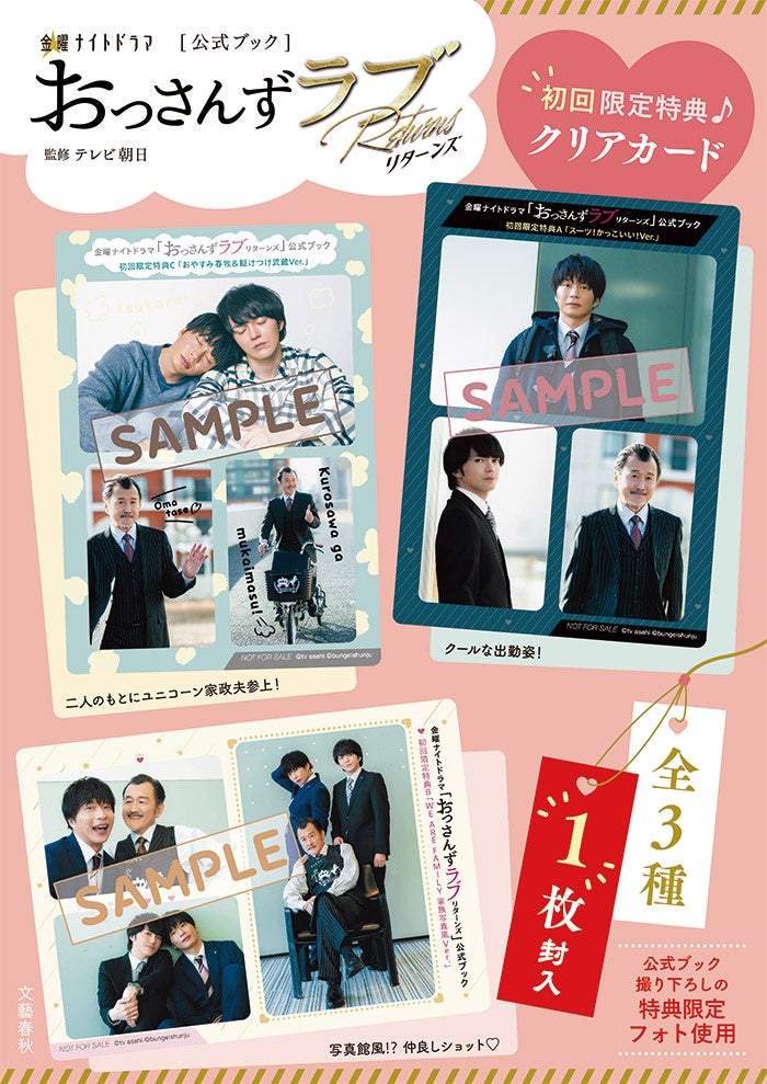 4月25日に発売される『金曜ナイトドラマ「おっさんずラブ-リターンズ-」公式ブック』には、春田・武蔵・牧のクリアカードが封入されます。