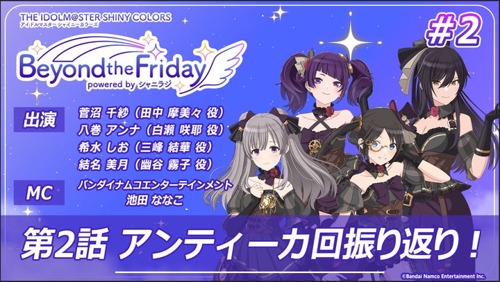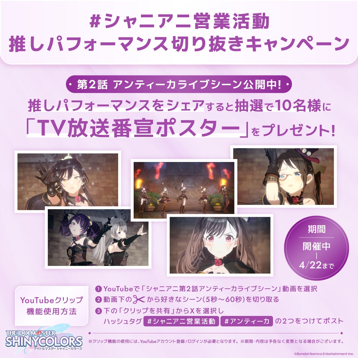 ASOBI CHANNELでは、金曜23:00からシャイニーカラーズ特集が配信中で、第2話の振り返りやアンティーカのライブシーンも公開されています。