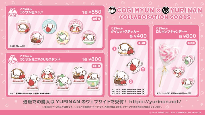 グッズにはランダム缶バッジ、ミニアクリルスタンド、ダイカットステッカー、ロリポップキャンディーがあります。
