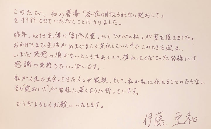 伊藤は「パパと私」でnote主催の「創作大賞」を受賞し、読者に感謝の気持ちを述べています。