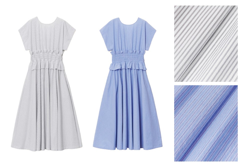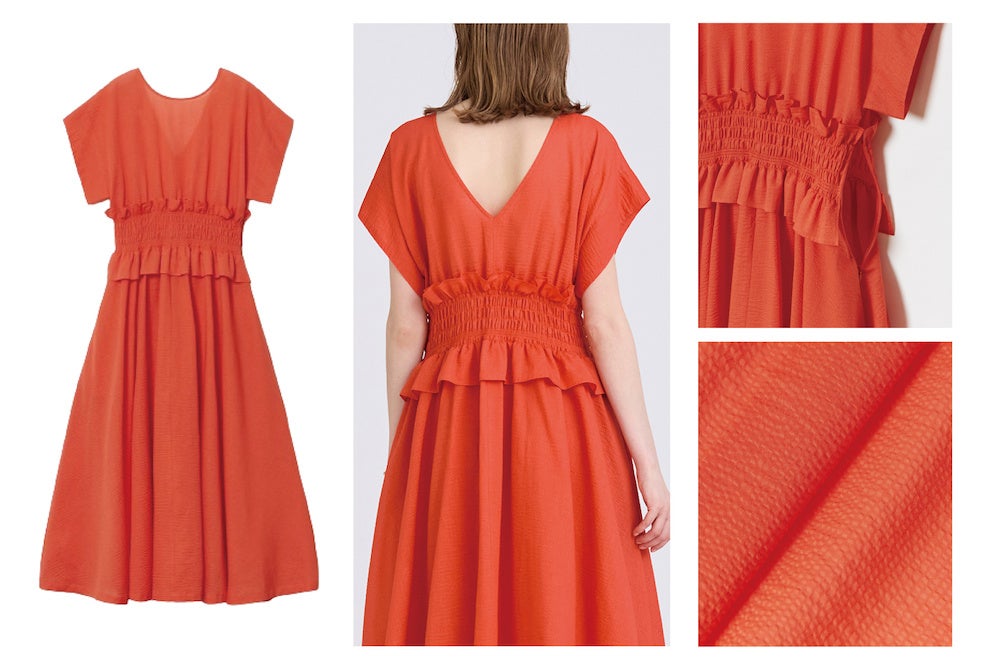 ウエストのシャーリングやフレアスカートが特徴で、クルーネックとVネックの2way仕様です。