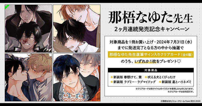 キャンペーン期間は2024年7月31日までで、対象商品を購入し発送完了すると、那梧なゆた先生直筆サイン入りクリアカードが抽選でプレゼントされます。