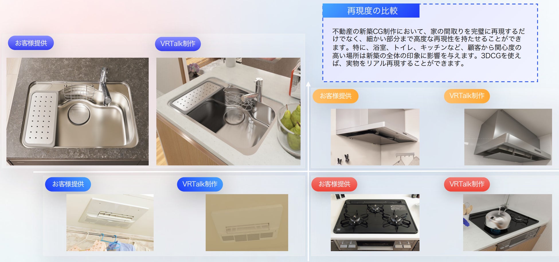 家の間取りをただ再現するだけではなく、細部までの高度な再現性が可能になっています。特に、浴室、トイレ、キッチンなど、顧客の関心が高い箇所は新築全体の印象に大きな影響を与えます。3DCG活用により、これらのエリアは現実と変わらない精密さで再現され、顧客の新築物件に対する理解を一層深めることができます。