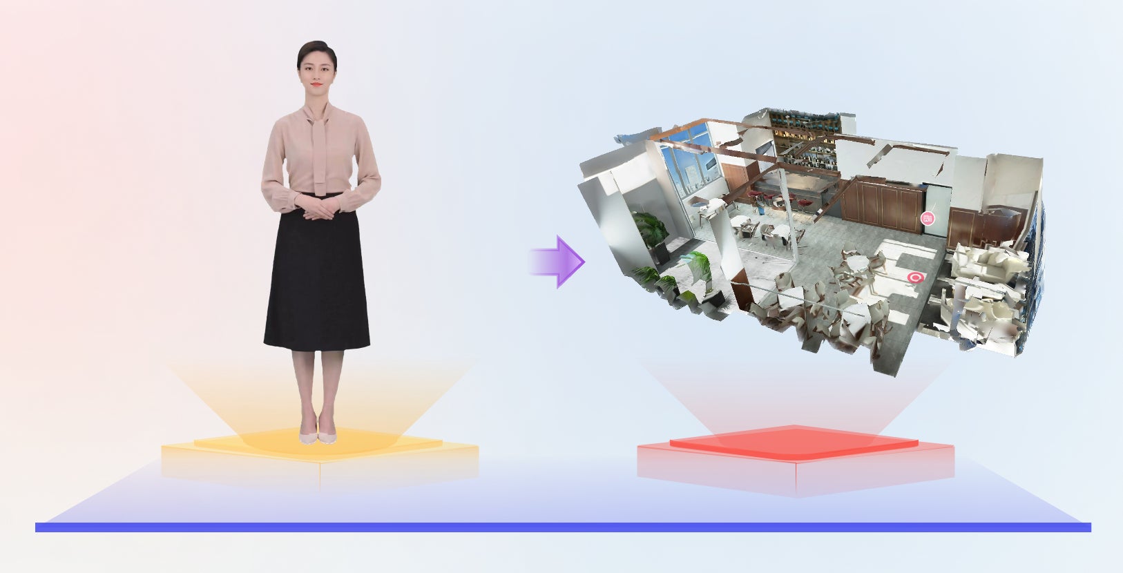 【ツアー編集】3Dオブジェクトの配置、2D画像や2Dビデオの配置、Matterportのようなタグの配置などを行うことができます。さらに、AIによるテキストから音声への転換や、デジタルヒューマン(オプションサービス)の生成などの機能も提供されています。これにより、より豊かなメディア情報を用いてVRを説明することが可能になります。