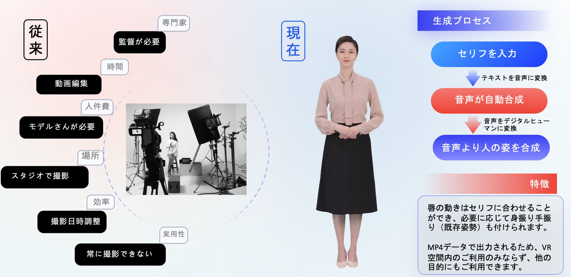 さらに、最先端の生成AI技術を採用し、単なるテキストだけでデジタルヒューマンを生成することが可能となる、VR業界初の革新的なサービスも提供する。