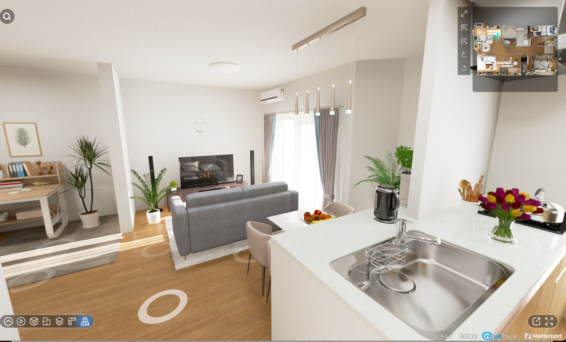 「VRTalk」のCG制作チームはお客様から提供する間取り図面や内装画像などもとにして、新築を3DCGで再現します。このサービスで建物の内部レイアウトの詳細な把握を可能にします。実際のサイズや色、材質までをも理解することができるのは特徴で、設計やレイアウトの変更も簡単に行うことが可能となります。さらに、「Matterport」のクラウドを通じて、オンラインで3D VR展示できるようになります。360度ビューやVR体験と組み合わせることができ、まるで物件を実際に歩いているかのような探索体験を提供します。特に、物件がまだ建設中である場合や、遠隔地にある場合にはこの技術の利点が際立ちます。そして、3DCGモデルはウェブサイトやSNS、プレゼンテーションなどに活用可能で、プロパティの魅力を効果的に伝えるマーケティングツールとしてもその価値を発揮します。これにより、物件の魅力を最大限に引き立て、効果的なマーケティングを実現します。