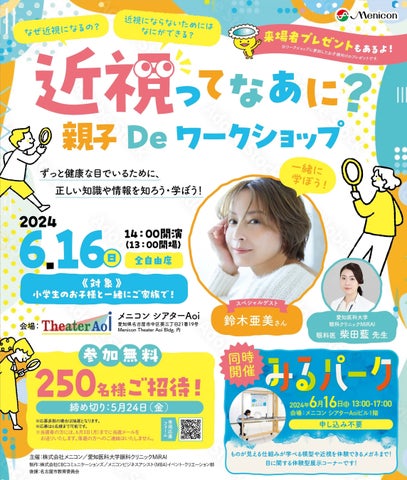 株式会社メニコンは2024年6月16日に、愛知医科大学眼科クリニックMiRAIと共同で「近視ってなあに? 親子Deワークショップ」を開催します。