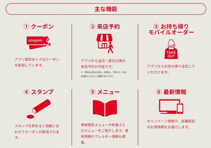 アプリには最新情報やクーポン、来店予約など便利な機能が揃っています。