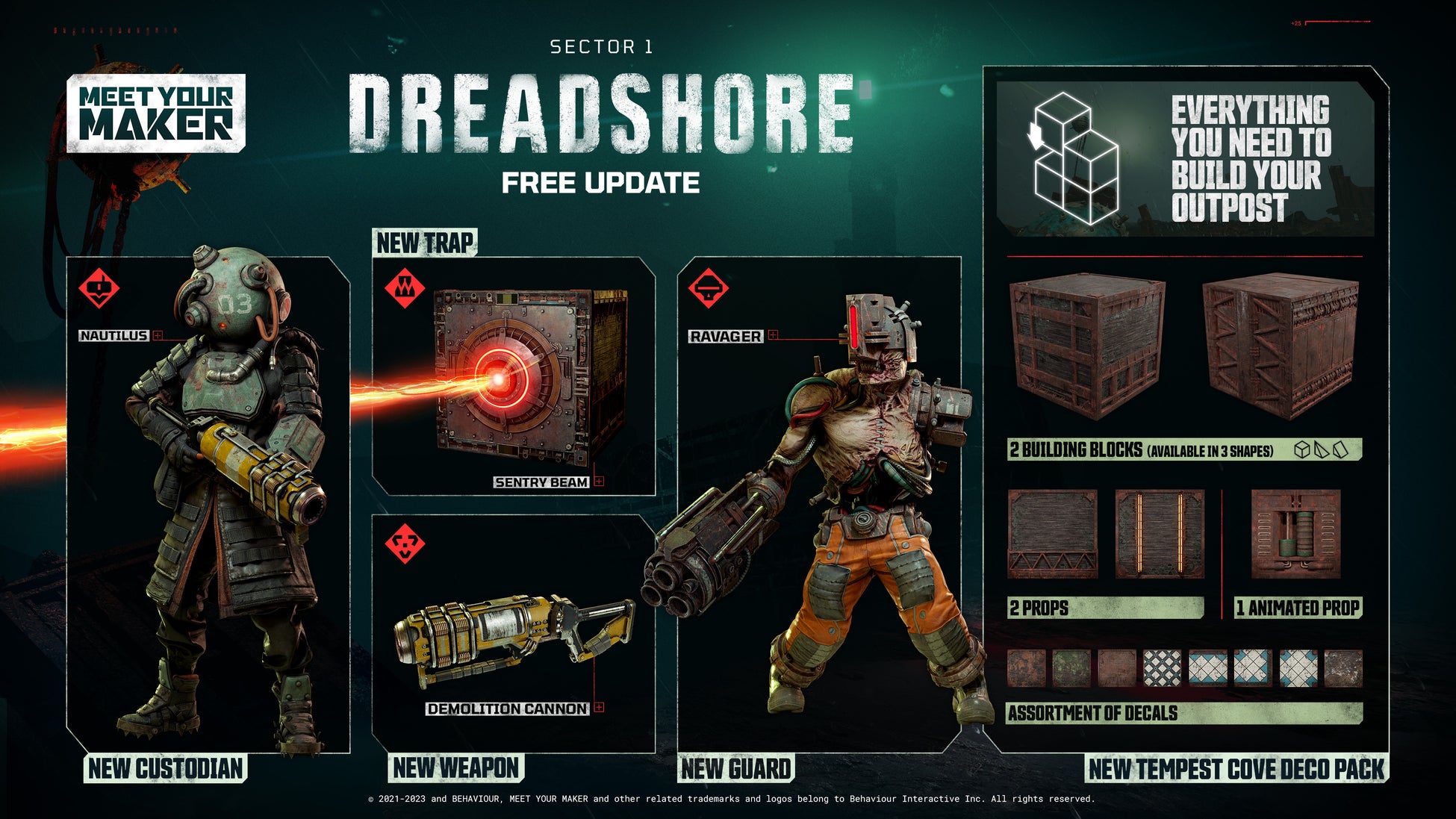 赤砂に覆われたレッドサンズから遠く離れ、ニューイングランドの海岸線に位置するドレッドショアには、改装された灯台の中に聖域が設けられ、恐ろしい秘密が隠されています。地下には広大な刑務所と研究所が置かれ、捕らえられた何百ものクローンに対し、筆舌に尽くしがたい科学実験の数々が行われていたのです。憂鬱で重苦しい空気が漂う海岸線を舞台としたこの新環境では、従来の『Meet Your Maker』では味わえなかった世界観が表現されています。「セクター1:ドレッドショア」は、今回のテーマに合わせてデザインされた新装飾パックと、新しい管理人、罠、番兵、武器を含む兵器庫パックとともにリリースされます。