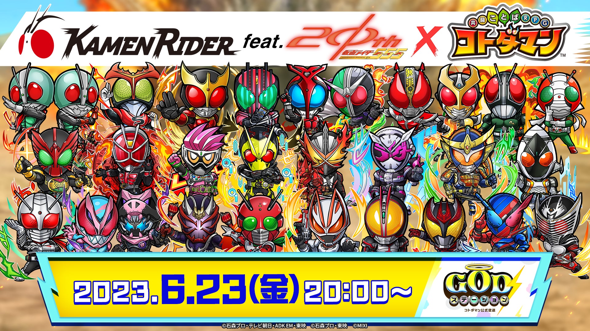 株式会社MIXI(東京都渋谷区、代表取締役社長CEO:木村 弘毅)は、スマホアプリの「ことば」で闘う新感覚RPG「共闘ことばRPG コトダマン」(以下コトダマン)において、仮面ライダー×コトダマンコラボ第5弾を、本年6月26日(月)より開催します。
