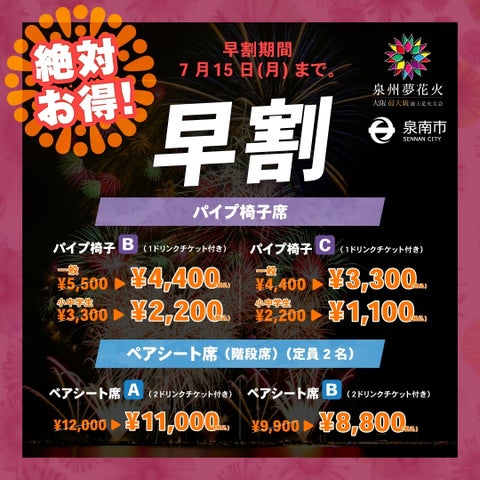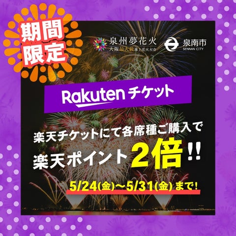 2024年8月24日に開催される「泉南夢花火 in 泉南」の有料観覧席が、2024年5月24日から楽天チケットで先行販売されます。