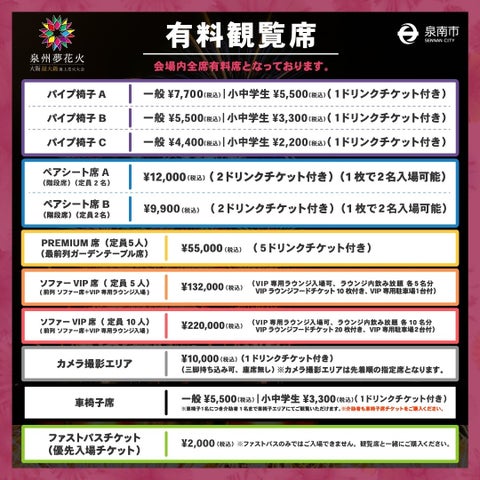 観覧席は自由席で、VIP席やガーデンテーブル席など様々な種類が用意されています。