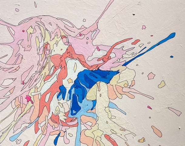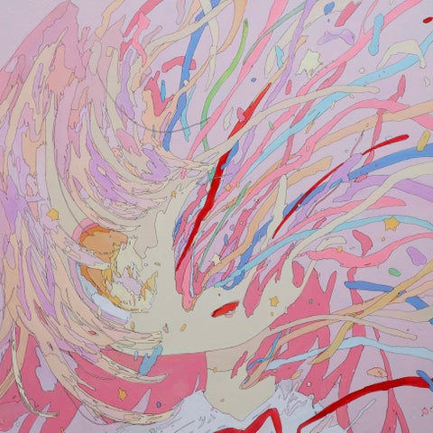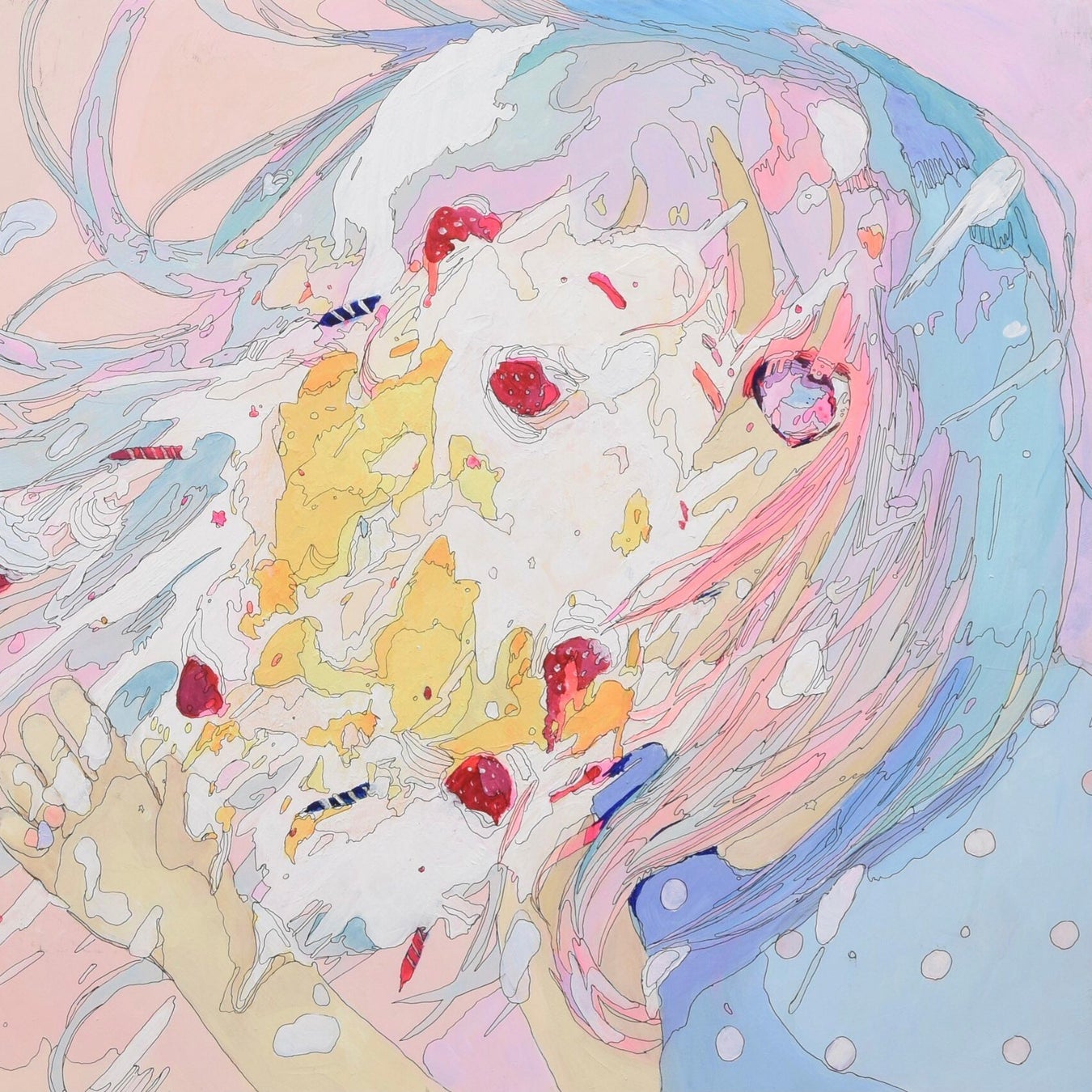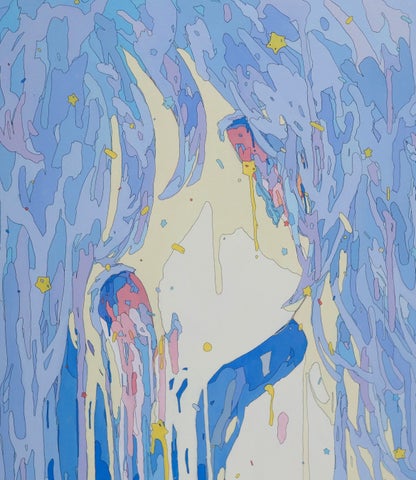 - 作品はアクリル絵の具とペンを使い、崩れ落ちて再生する少女を描く
