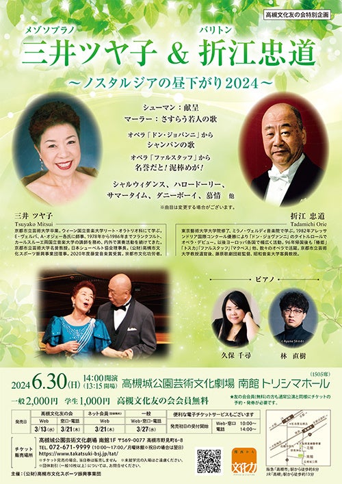 三井ツヤ子さんは高槻市文化スポーツ振興事業団理事であり、折江忠道さんは藤原歌劇団総監督を務めるバリトン歌手です。