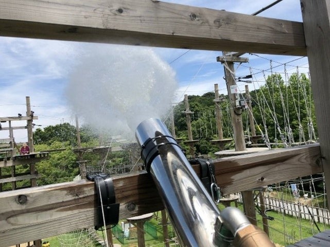 エリア内では7つの水大砲から水しぶきが飛び交い、宝箱のヒントカードを見つけて水鉄砲で解読します。