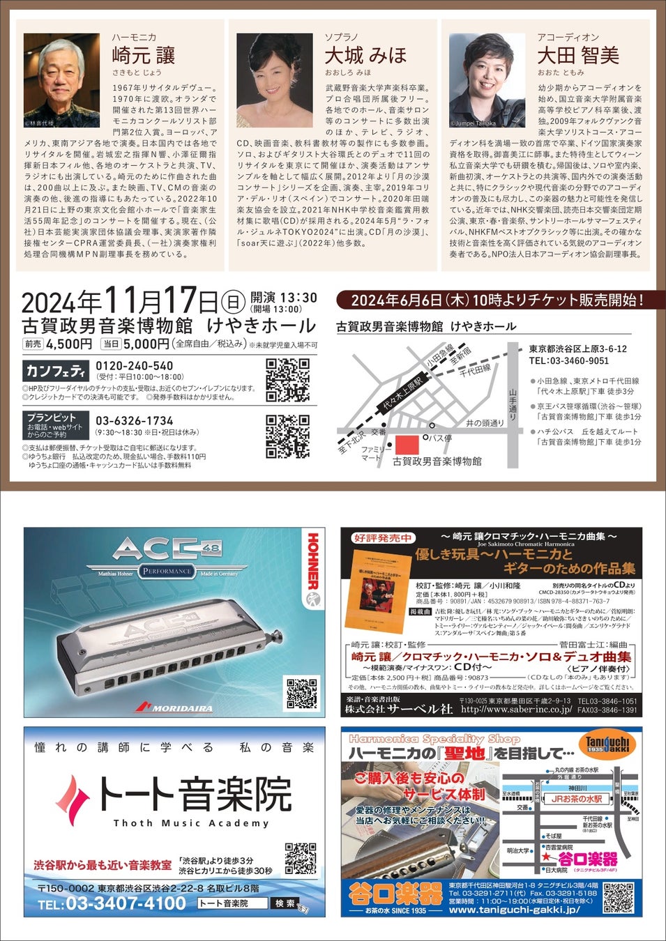 2024年11月17日、古賀政男音楽博物館で開催されるプランピットのコンサート「ファンタスティック・トリオⅡ~HARONICA・SOPRANO&ACCORDION」では、ハーモニカ、アコーディオン、ソプラノの演奏が楽しめ、様々な名曲が披露されます。