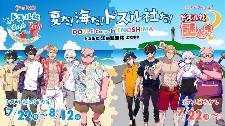 イベントでは、①SWEETS PARADISEとのコラボカフェ「ドズル社Cafe -アロハ‐ in 海の家」②初の謎解きイベント「ドズル社謎とき in 江の島」が楽しめます。