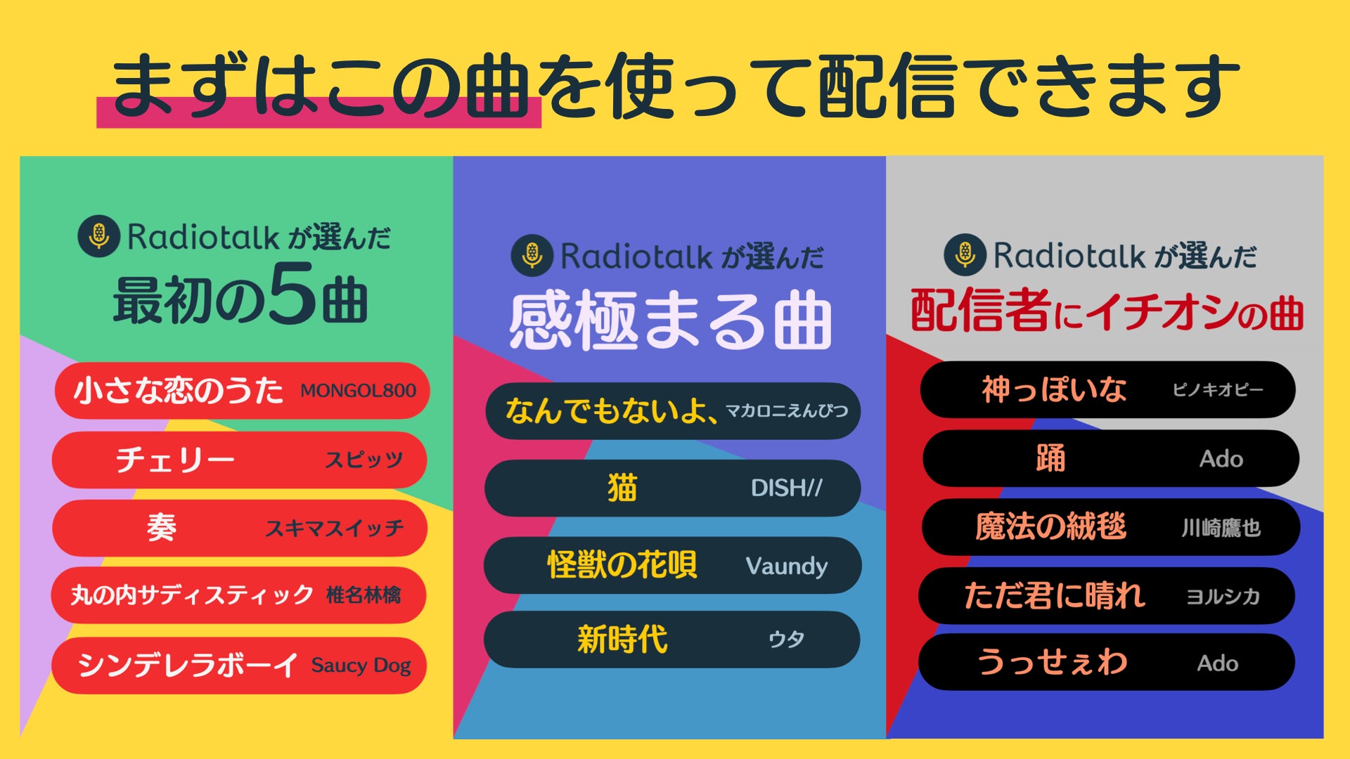 Radiotalkは、スマホひとつで人気楽曲のインストロメンタルを流しながら、歌やトークを配信できる「声だけ」のライブ配信サービスである。