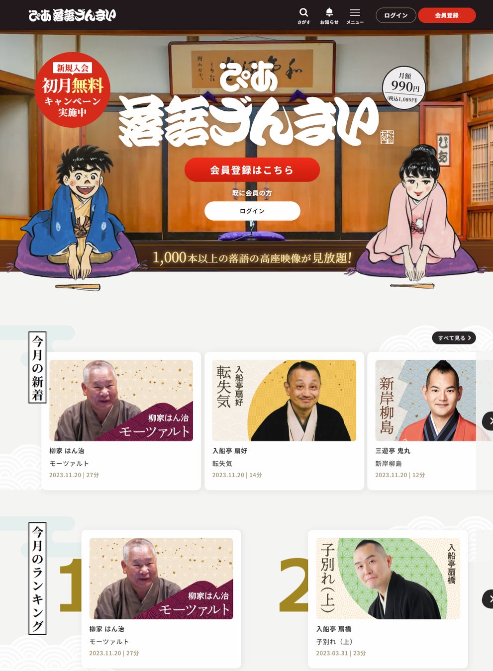 配信作品には桂歌助や三遊亭朝橘などの名前があり、詳細は公式サイトで確認できます。