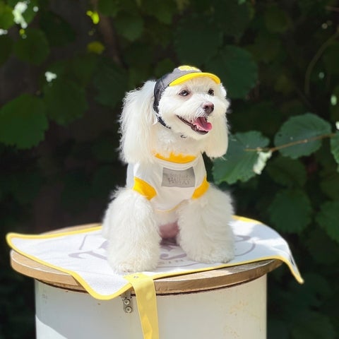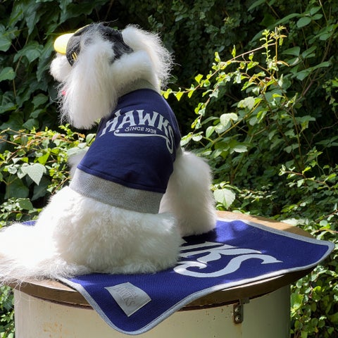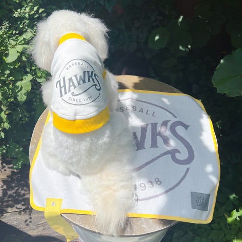 ホークスのベースボールキャップをモチーフにしたドッグキャップやカフェマットなどが用意されています。