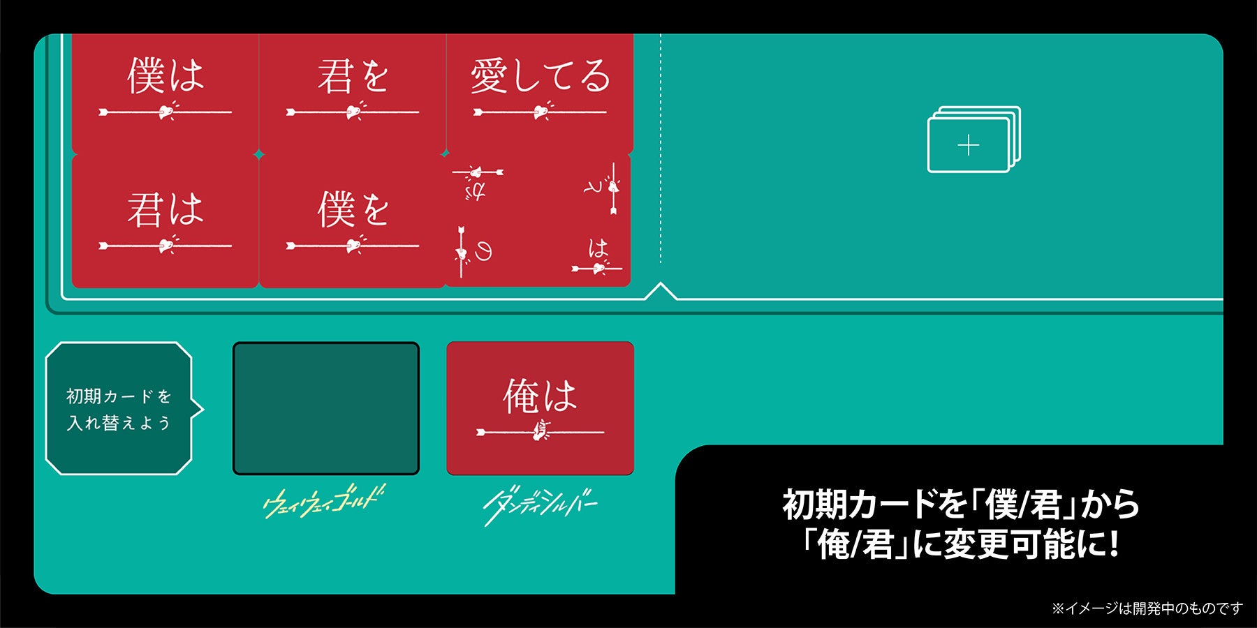 拡張セットを使うことで、プレイ人数が1人増え、基本セットでは「僕/君」だった初期カードを「俺/君」に変更することも可能です。