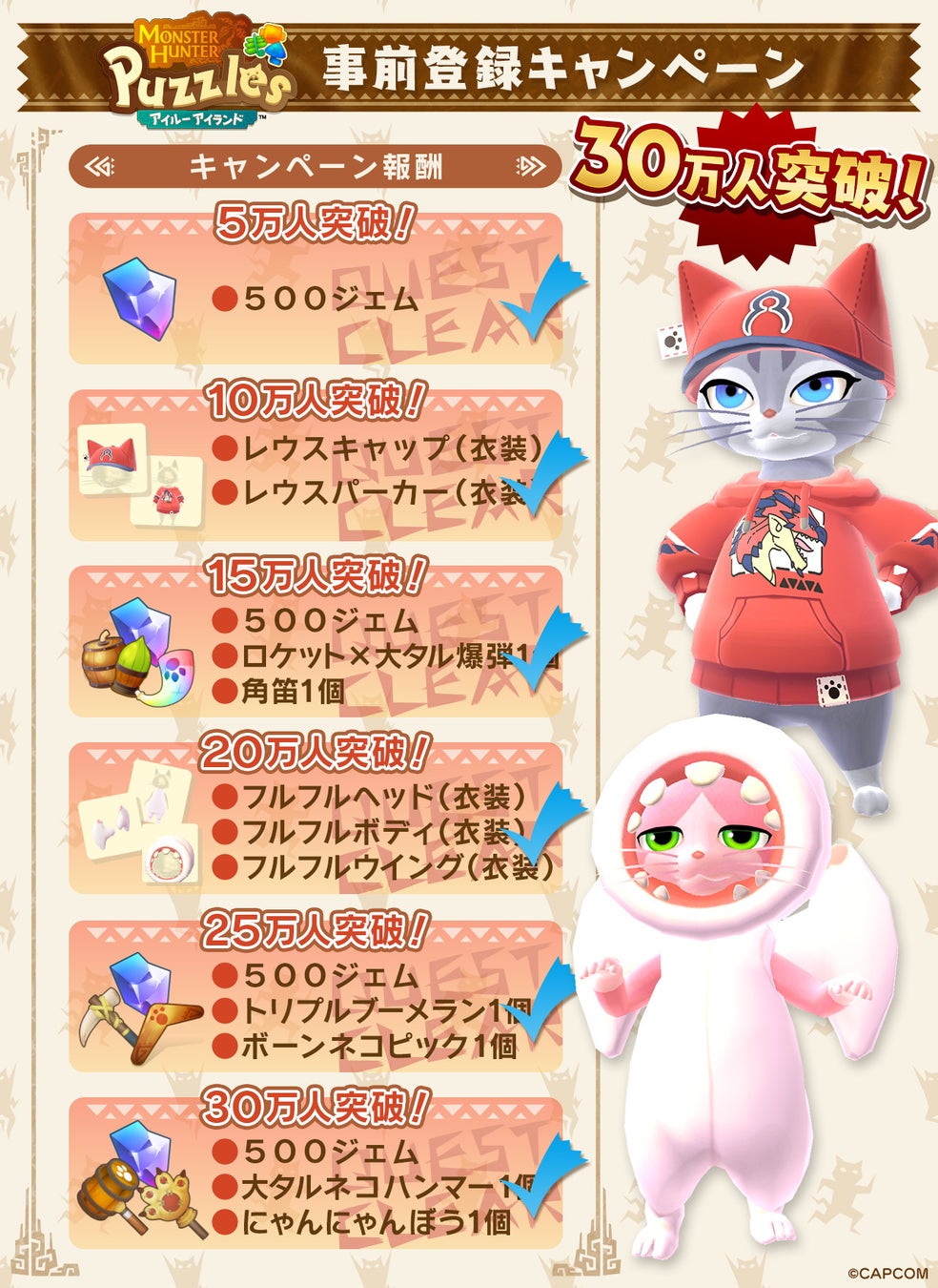 5万人達成で500ジェム、10万人達成でレウスキャップとレウスパーカー、15万人達成で500ジェム、ロケット×大タル爆弾、角笛、20万人達成でフルフルヘッド、フルフルボディ、フルフルウイング、25万人達成で500ジェム、トリプルブーメラン、ボーンネコピック、30万人達成で500ジェム、大タルネコハンマー、にゃんにゃんぼうがプレゼントされます。