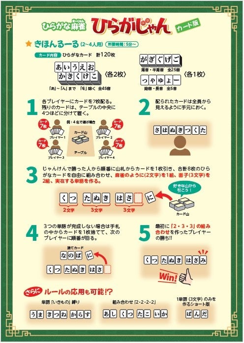 『ひらがじゃん』は、手札7枚と引いた札の合計8枚で、麻雀のように「2・3・3」の単語の組み合わせを早く作ることを競うゲームです。