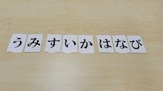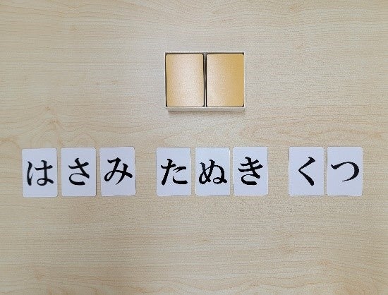 ひらがなのみのシンプルなカードに、麻雀の戦略性や駆け引きを掛け合わせた知育ゲームで、2文字と3文字の組み合わせで単語を作って最初に「2・3・3」の形を完成させた人が勝ちになります。