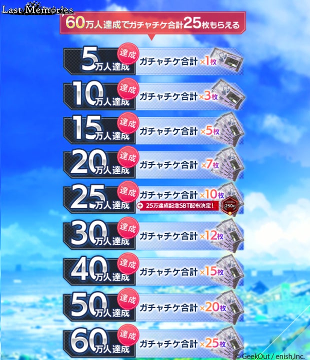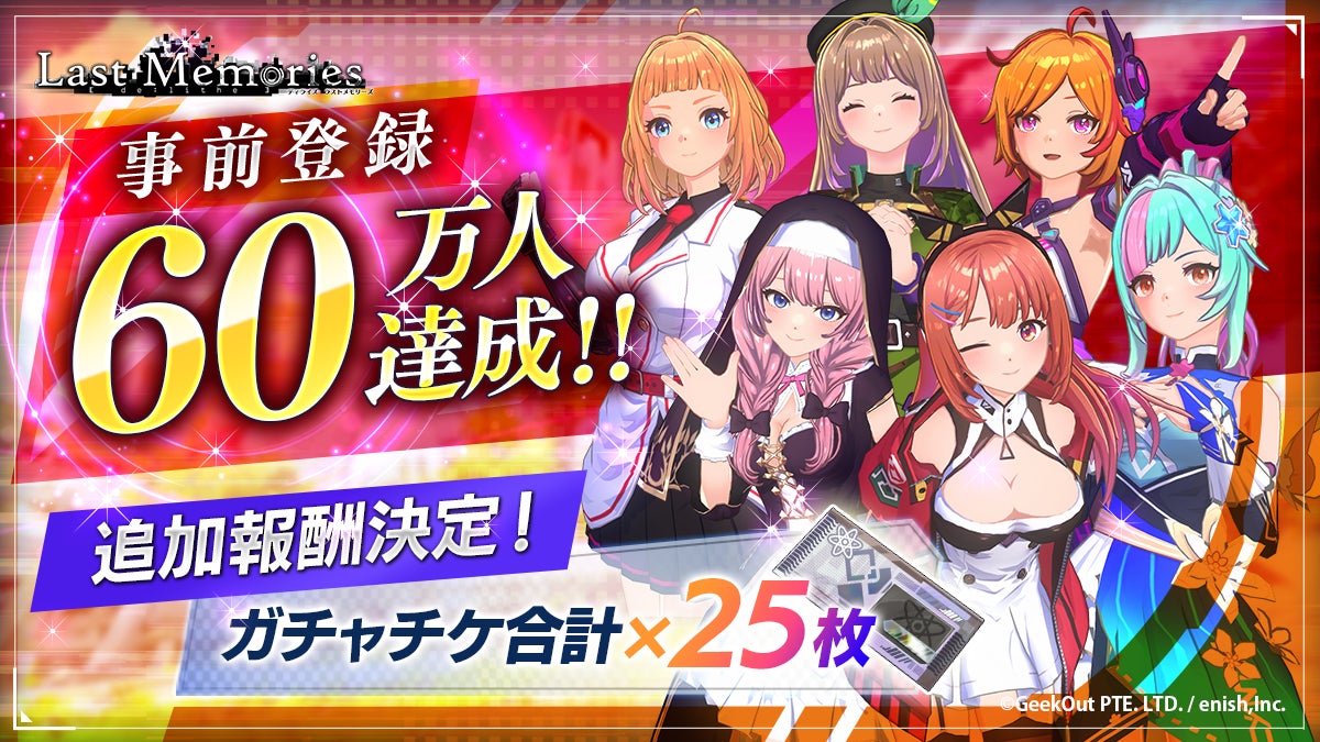 - 事前登録者数が60万人を突破し、ガチャチケット25枚のプレゼントが決定。