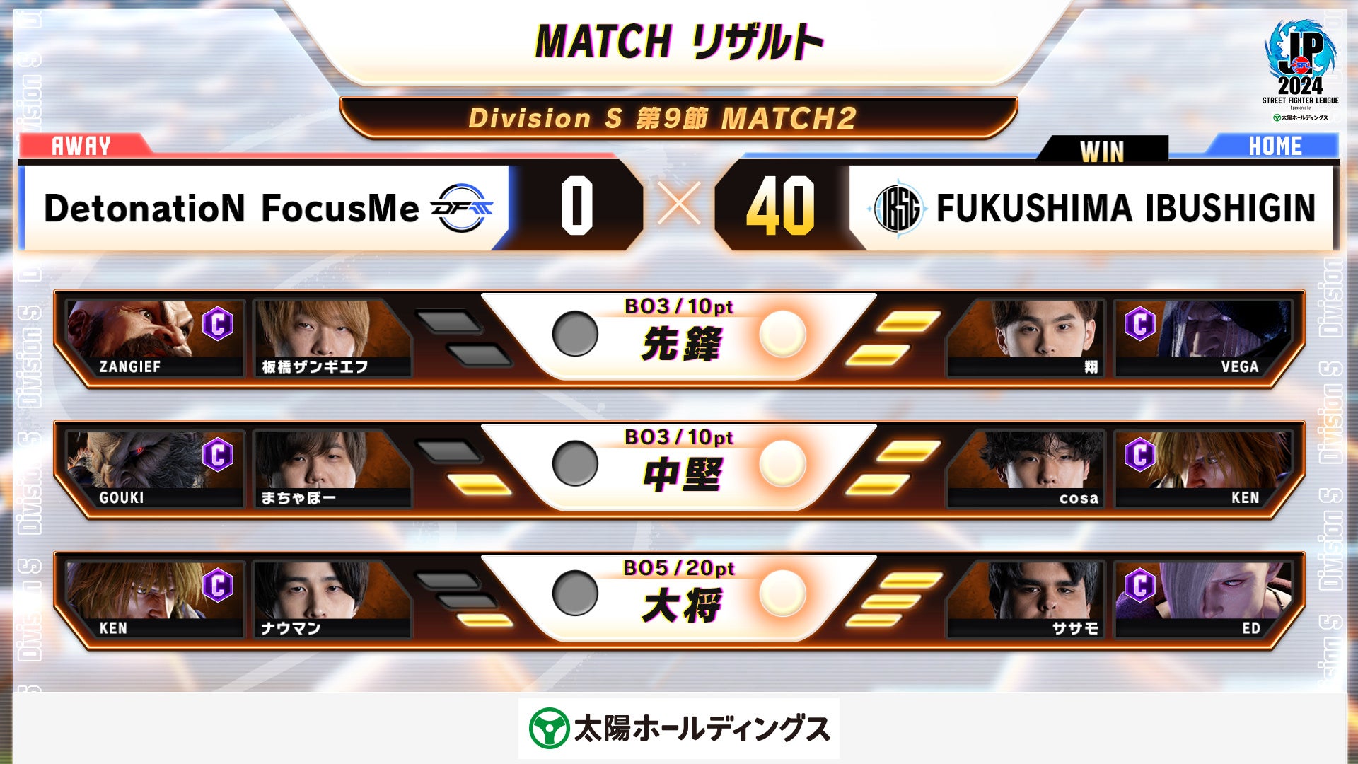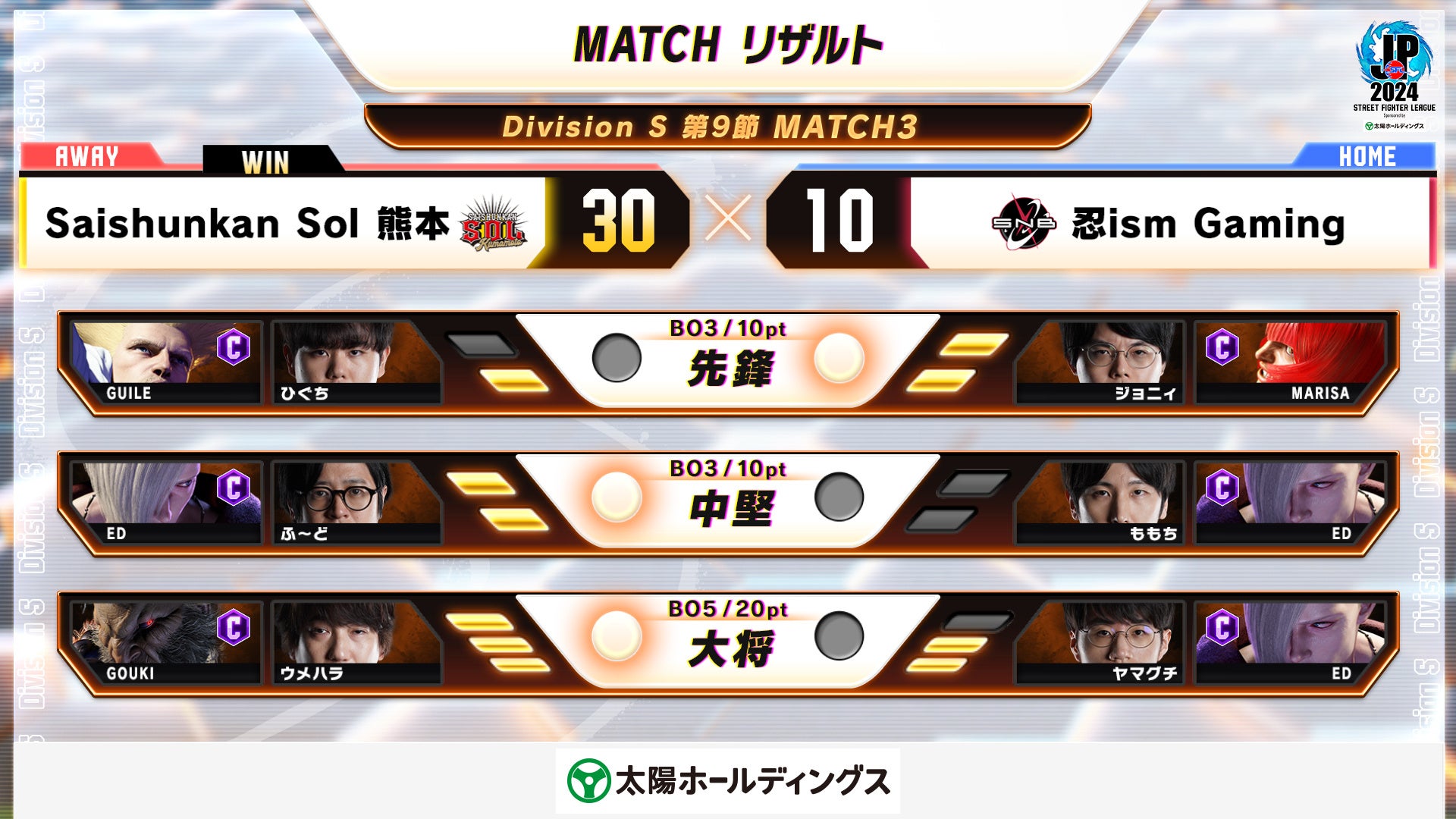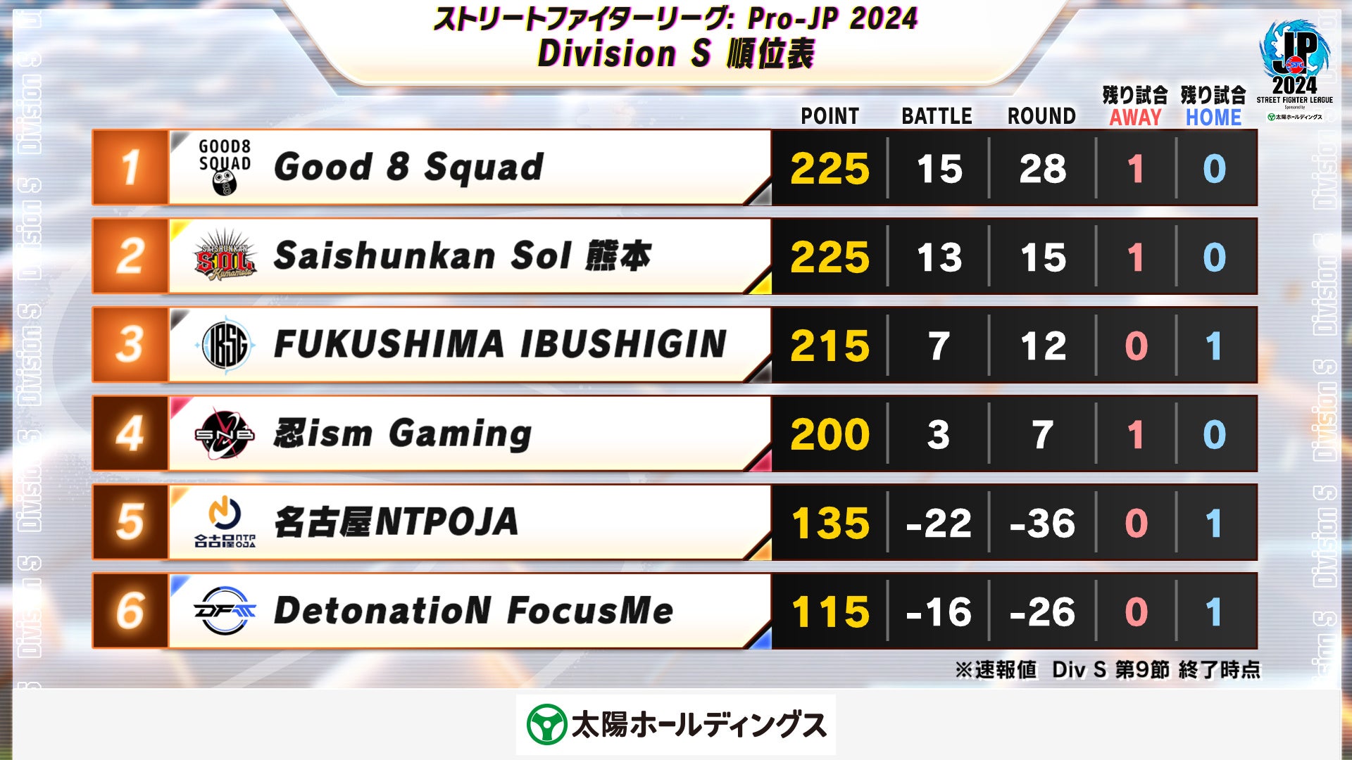 11月5日に行われた『ストリートファイターリーグ: Pro-JP 2024 Division S 第9節』の結果速報です。