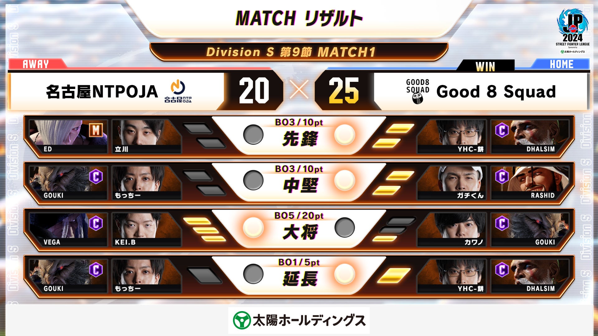 - Good 8 Squadが名古屋NTPOJAに勝利し、ポイントランキング首位をキープ
