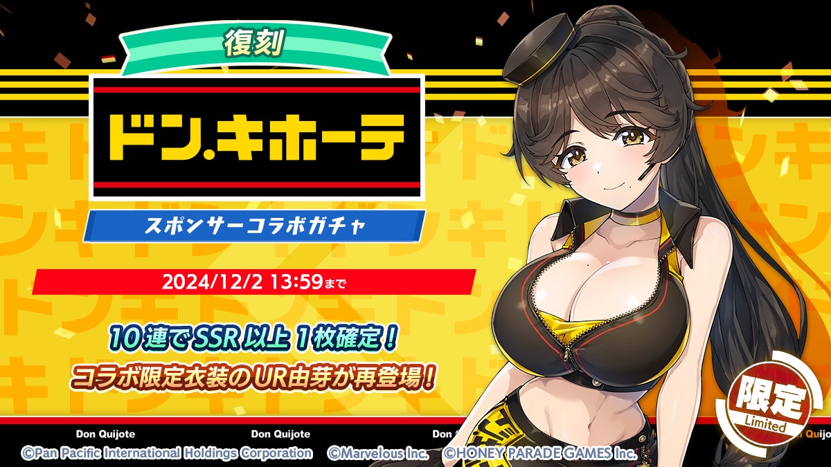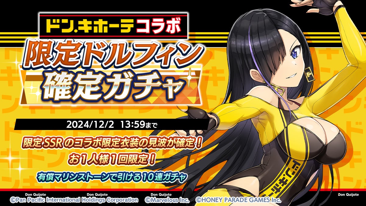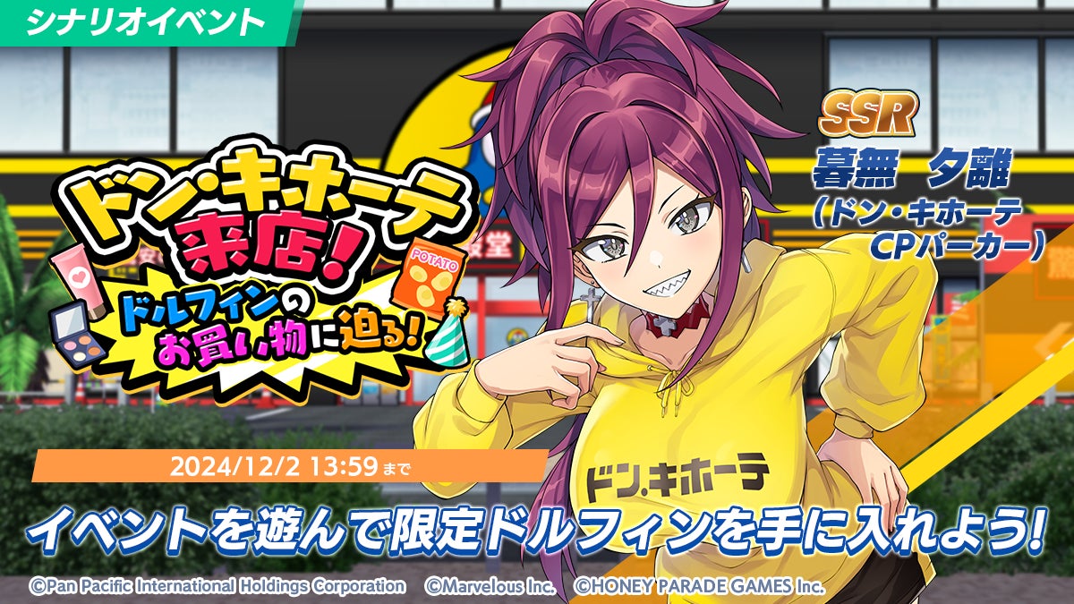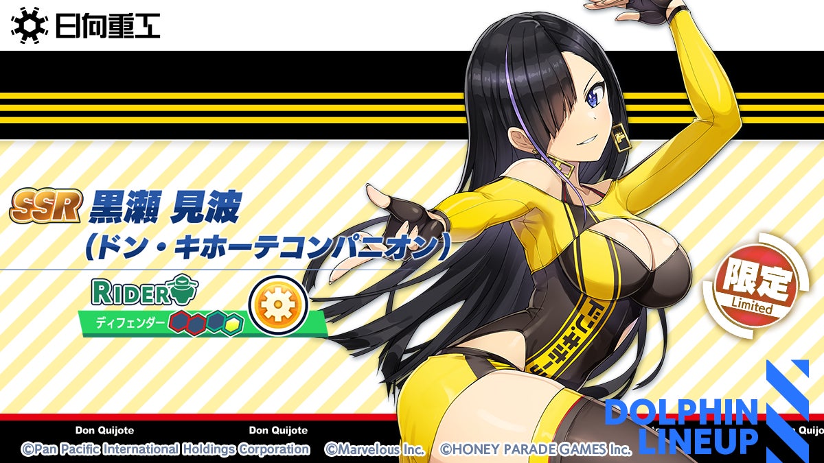 コラボ限定ドルフィンは、SSR 黒瀬 見波(ドン・キホーテコンパニオン)、UR 山葉 由芽(ドン・キホーテCPガール)など、ドン・キホーテをイメージした衣装を身につけたキャラクターが登場します。