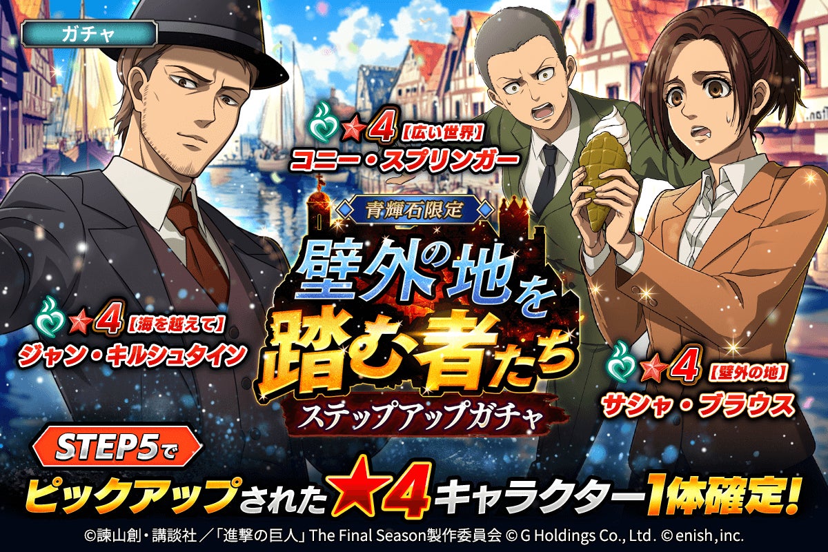 ジャン、コニー、サシャの新規キャラクターがピックアップされ、ステップアップガチャでは★4団員が1体確定します。