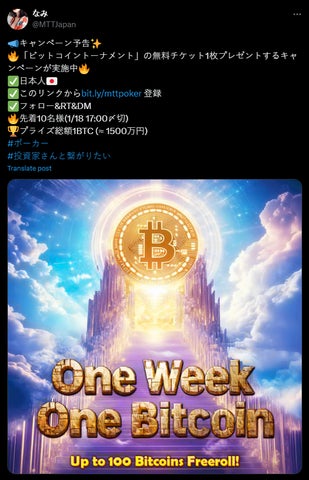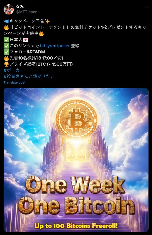 プレイヤー「なみ」の貢献を称え、ビットコイン週末トーナメントのチケットを抽選でプレゼントするキャンペーンを実施中。