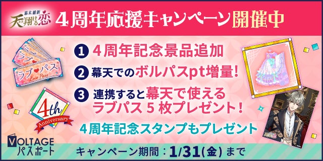 また、ポイントサイト「VOLTAGEパスポート」でも4周年応援キャンペーンを実施しており、限定アバターやポイント増量、ラブパスプレゼントなどの特典が用意されています。