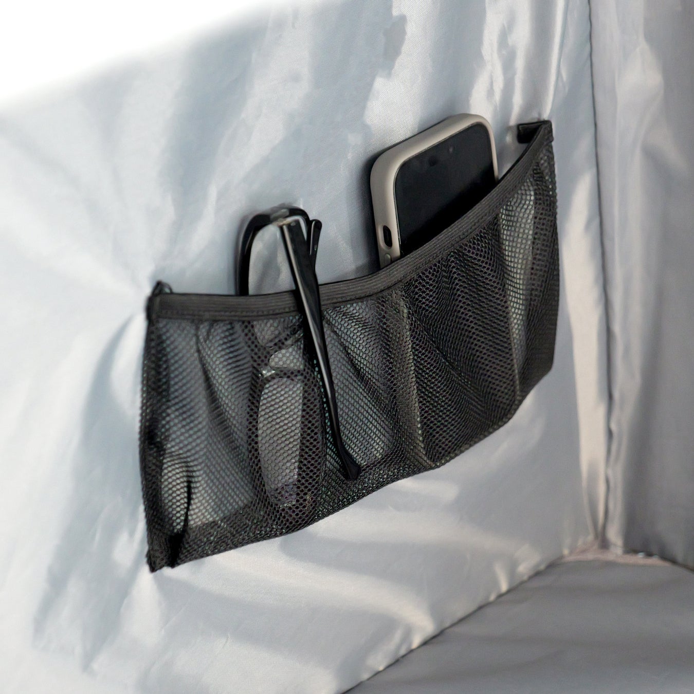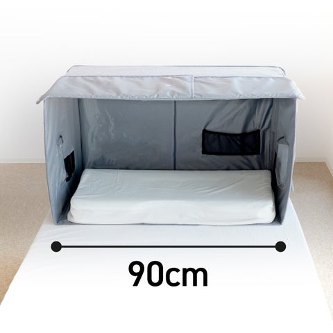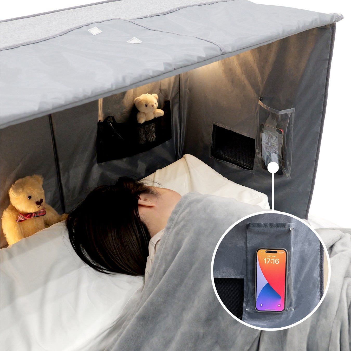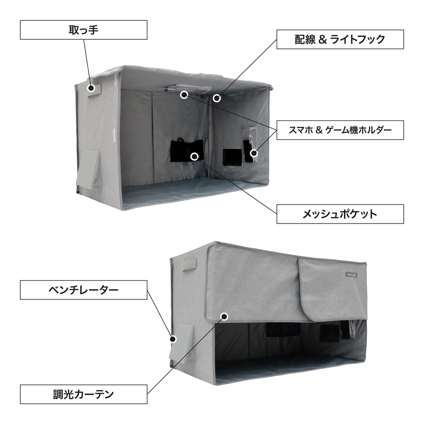 シングルベッドに対応したワイドな設計で、メッシュポケットやフックも備えています。