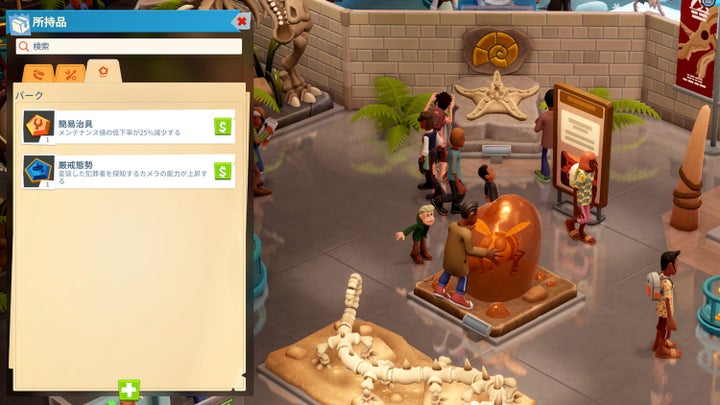 - 展示品の分析では知識、啓発、パークを獲得し、新しい装飾品やアイテムをアンロックできる。