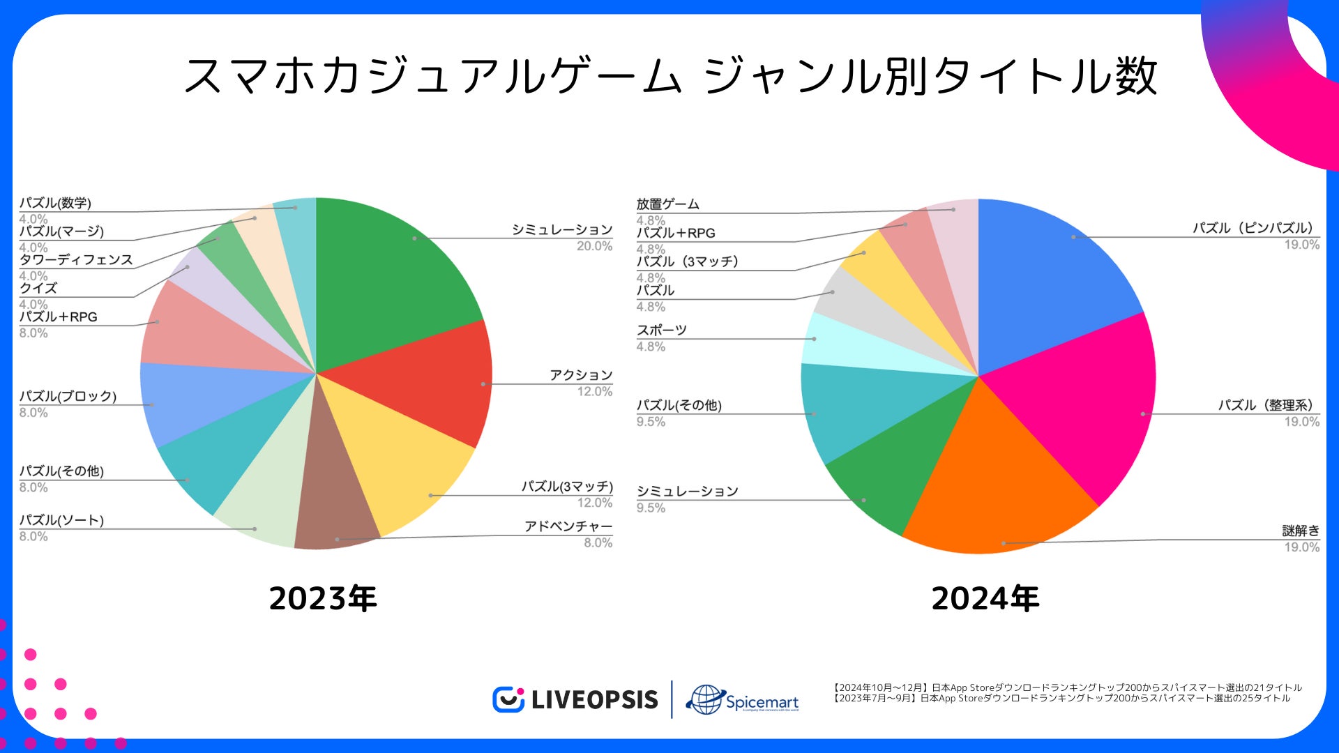 調査によると、アプリ内課金と広告の併用であるハイブリッド型収益モデルが81%と増加傾向にあり、パズルゲームの人気は継続するものの、「整理系」や「ピンパズル」といった新たなジャンルの台頭が見られました。