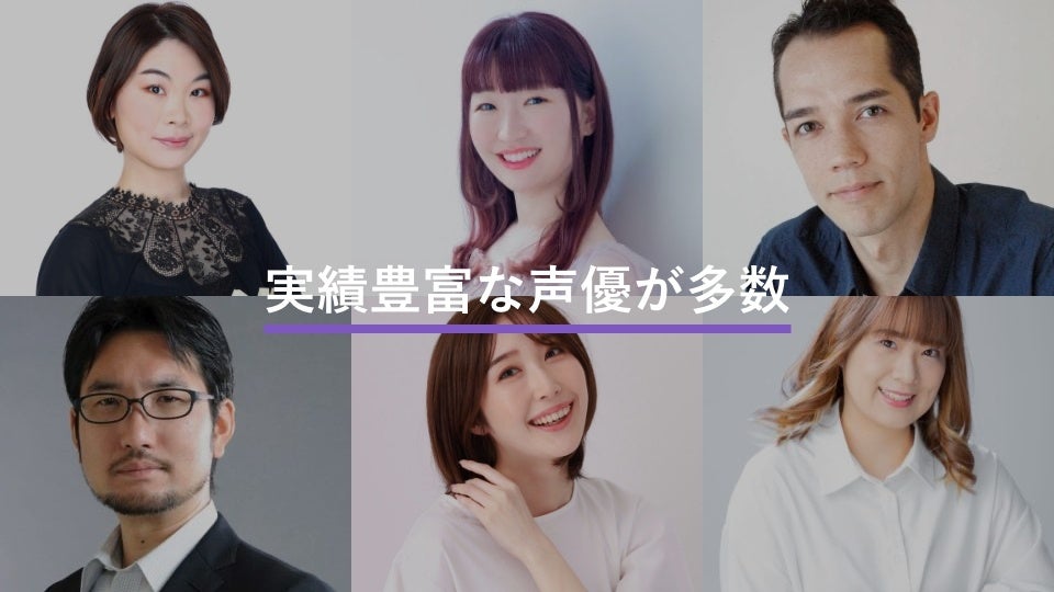 豊富な実績を持つ男性声優(殿所篤、鈴村一也、勝沼紀義、矢嶋友和)と女性声優(藤原エマ、沢井エリカ)の紹介や、ナレーション、多言語対応サービスなども提供しています。