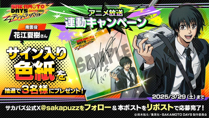 公式X(@sakapuzz)をフォロー&対象投稿をリポストで、南雲役・花江夏樹さんのサイン色紙が抽選で3名に当たります。
