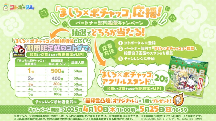 さらに、コトダマンのキャラクター「ましろ」とポチャッコが「2025年サンリオキャラクター大賞 パートナー部門」にエントリーしており、これを記念したキャンペーンも開催されます。