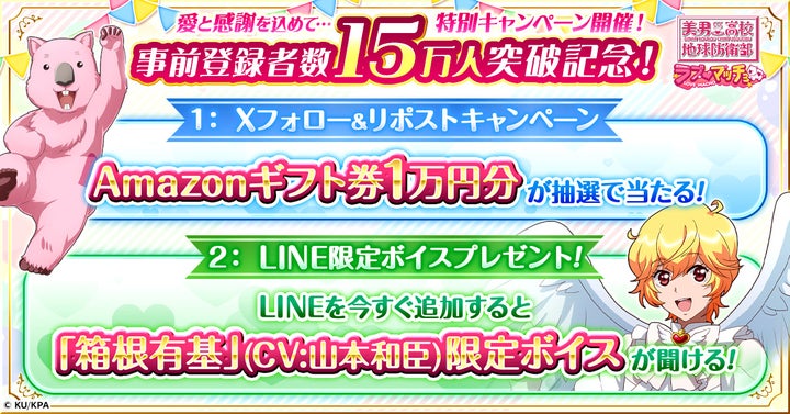 - 「美男高校地球防衛部ラブマッチョ」事前登録15万人突破記念キャンペーン実施。