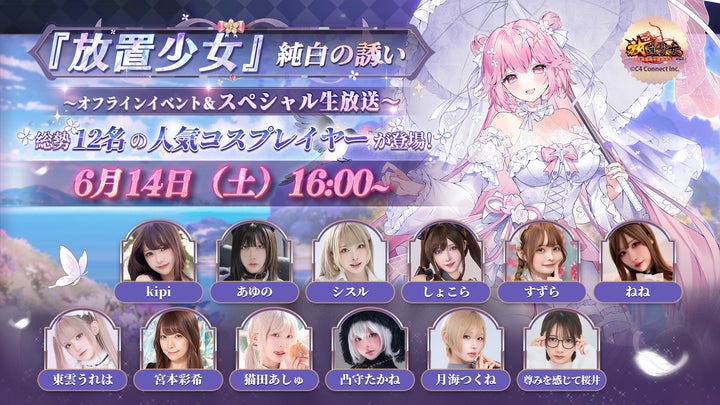 C4 Connect株式会社が提供するスマホアプリ『放置少女〜百花繚乱の萌姫たち〜』の生放送「純白の誘い~オフラインイベント&スペシャル生放送~」が6月14日(土)16時から配信される。