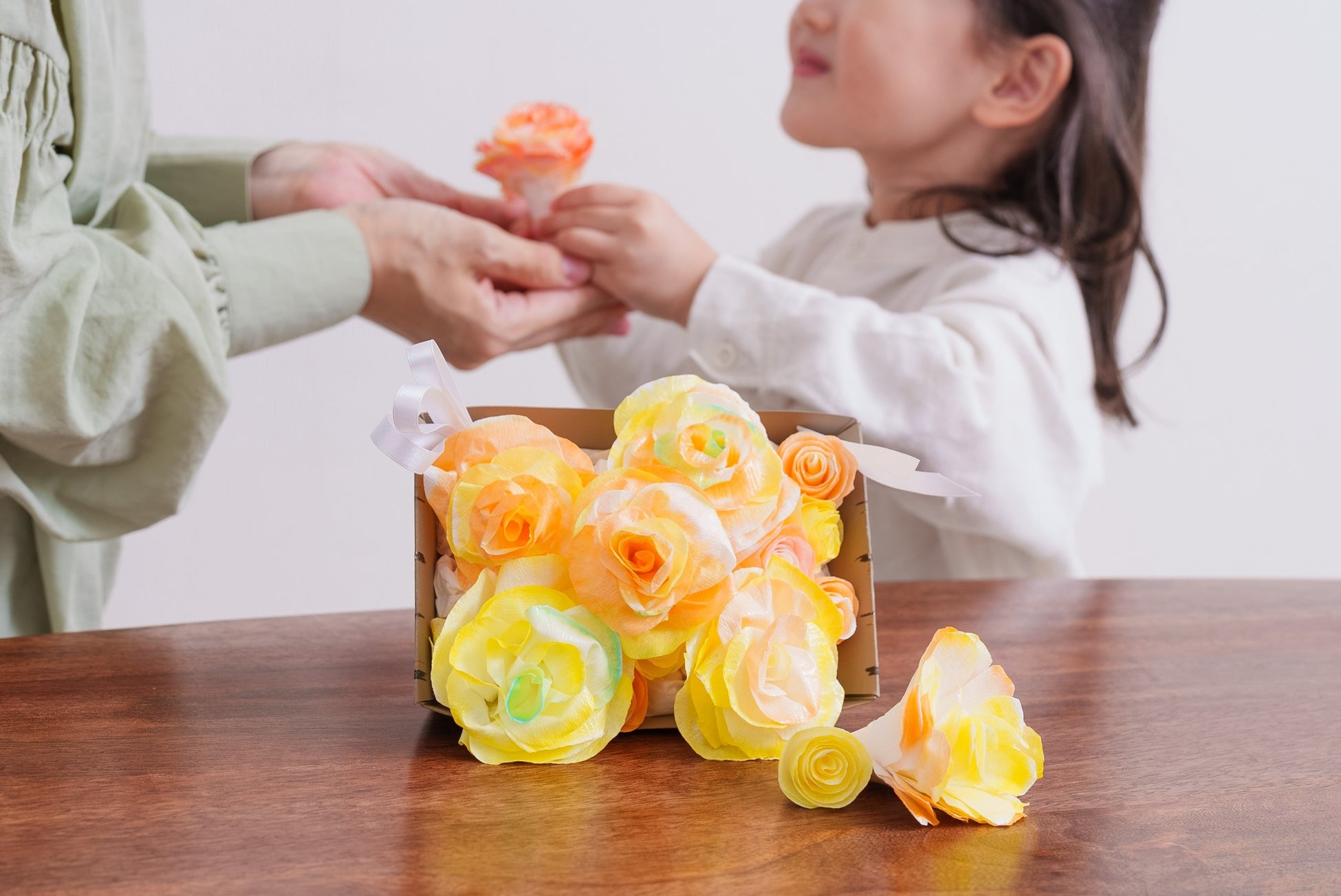 グラデーションフラワーは、毛細管現象の原理を学びながらカラフルな花を作るキットで、バスケットやリボンも付属しています。