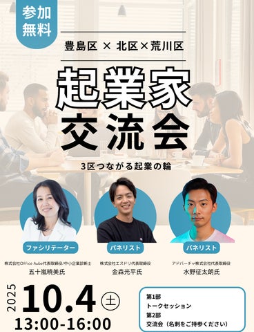 アドバーチャ株式会社代表取締役の水野征太朗氏が、豊島区・北区・荒川区が合同で開催する起業家交流イベント「3区つながる起業の輪」に登壇する。