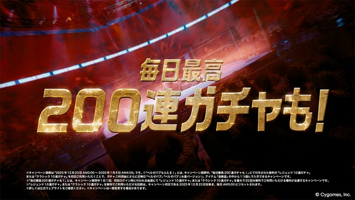キャンペーンでは、毎日ログインで最大200連ガチャ無料、最終日は200連ガチャ無料確定。