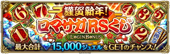 ログインボーナスでは、最大5日間で3,000ジュエルなどが、最大3日間で5,000ジュエルなどが、最大15日間でロマサガRSくじ交換券が配布されます。